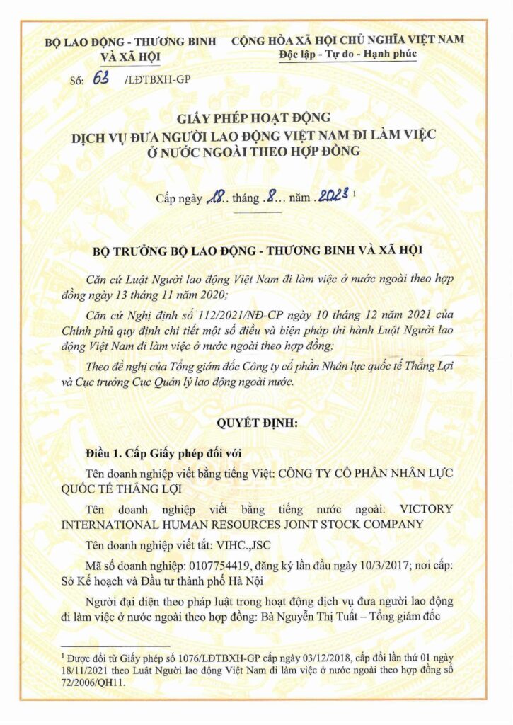 Thắng Lợi., JSC được bộ lao động cấp phép đưa người lao động đi làm việc tại nước ngoài lần đầu ngày 10/03/2017. Có trụ sở rõ ràng cả Hà Nội và Hồ Chí Minh cùng với 8 năm kinh nghiệm trong lĩnh vực xuất khẩu lao động, với đội ngũ nhân viên nhiều kinh nghiệm, tận tâm, Thắng Lợi JSC là công ty uy tín đã đưa hàng nghìn lao động làm việc tại nước ngoài trong những năm qua và mang lại nhiều cơ hội việc làm tại nước ngoài cho lao động mới.